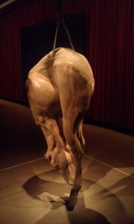 An installation of a group of male mannequins who’d been castrated, hung upside down and dismembered.