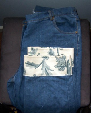 I had some samples of upholstery fabric which I was holding onto to do something with one day. That day came today. I cut it up, stitched a cuff and sewed it onto the bottom of one of the new pairs of jeans. Now I’m looking for another interesting fabric to do the other pair… paisley would be nice. I’ll be wearing this pair to work on Tuesday. I’ll let you know how it goes. 🙂