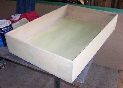I found a great, big old box at the tip shop. It was like a large drawer, about 3ft wide, 2ft deep and 7in high. It was painted a mauvey colour and was a bit rough. I sanded it back enough to remove most of the old paint but not totally, cleaned it up, then painted it a pale green. In order to give it a more interesting, aged, appearance, I wiped some of the paint off to expose some of the grain, giving it a limed appearance. I then gave it a couple of coats of estapol to seal it and make it easy to wipe clean.