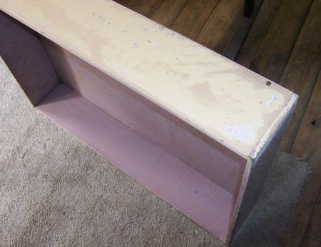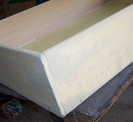 I found a great, big old box at the tip shop. It was like a large drawer, about 3ft wide, 2ft deep and 7in high. It was painted a mauvey colour and was a bit rough. I sanded it back enough to remove most of the old paint but not totally, cleaned it up, then painted it a pale green. In order to give it a more interesting, aged, appearance, I wiped some of the paint off to expose some of the grain, giving it a limed appearance. I then gave it a couple of coats of estapol to seal it and make it easy to wipe clean.