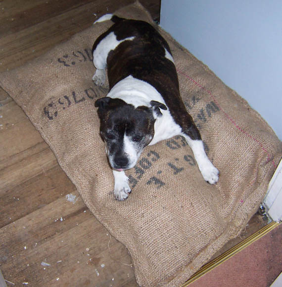 Long story: when we first moved here Mischa and Barney were outside dogs. They had beds in the garage, then on the deck. When Wayne went to Adelaide on holiday I made a bed for them in the entrace and they’ve been sleeping in the house since. In fact we now have to pry Barney out of bed in the morning or to go out and pee at night.