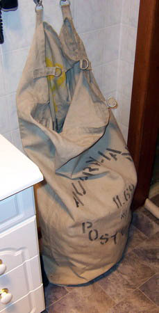 It goes with my postal bag come laundry basket! This post bag was going to be thrown out so we gave it a home. Took me a while to figure out what I wanted to do with it but I love it. I put 2 hooks in the bathroom wall and hang it there. When its full I sling it over my shoulder and take it down to the washing machine. (Our bathroom is Ugly with a capital U. One day…)