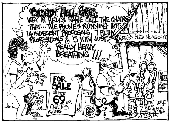We were invited to Sharon’s 40th birthday yesterday and Wayne did one of his wonderful cartoons for her. I matted and framed it. The joke is that her husband is making chairs out of horse shoes and it takes 69 shoes to make one chair. Wayne’s work is great isn’t it?