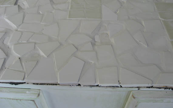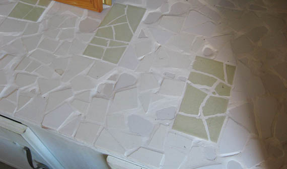 I used plain white tiles I found at tip shops, not all the same thickness, broke those and used them in a random fashion to achieve a contrast between the oblongs of green and the randomness of the white. The result is an uneven ‘textured’ surface with a sort of geometric pattern.