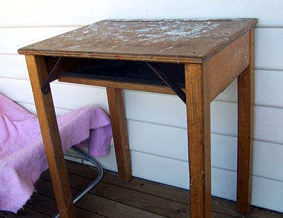 When I started making the porch look pretty and inviting, I realised I needed a table to sit coffee cups and books on. I looked around and thought one of the school desks would do perfectly with a makeover.