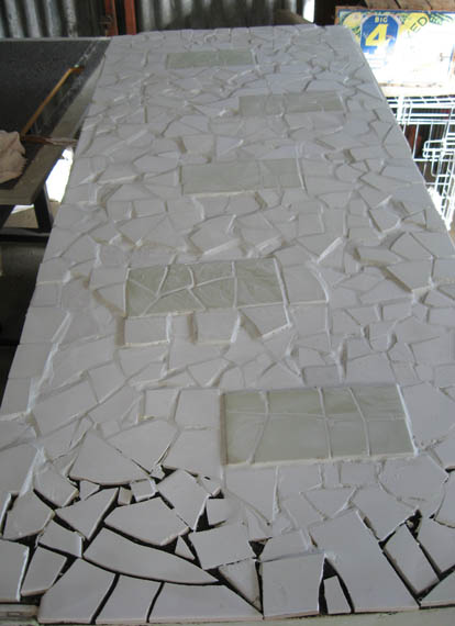 I used plain white tiles I found at tip shops, not all the same thickness, broke those and used them in a random fashion to achieve a contrast between the oblongs of green and the randomness of the white. The result is an uneven ‘textured’ surface with a sort of geometric pattern.
