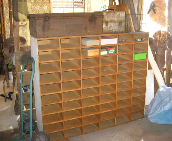 So, here’s a photo of my ‘new’ whiz bang workshop organiser. Eventually I’ll put wheels on it so I can move it easily and I’ll find/make/adapt boxes to fit into the slots as drawers. For now, I’ve started sorting things into whatever containers I had handy which fit into the shelves. I’m so excited. I can finally see my work surfaces again – I only have to pull out 4-5 boxes to find the one I need.