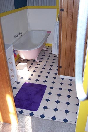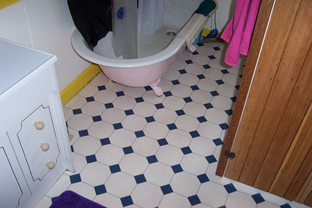 What about the colour, huh? White walls, ok, blue and white vinyl on the floor, ok, egg yolk yellow trims….