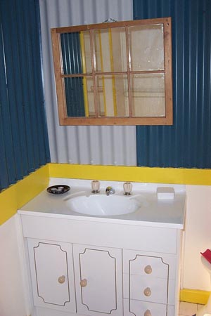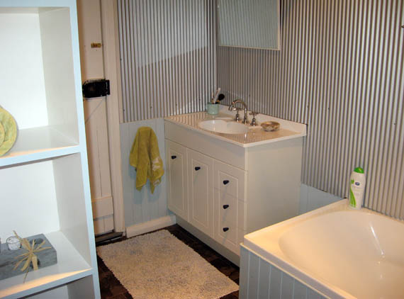 Interesting wall treatment. In theory. I mean, I used mini-orb to redo the bathroom walls (that’s mini corregated iron in zinc finish). They used sheets of colourbond and they alternated them right way (blue), wrong way (grey) for artistic effect.