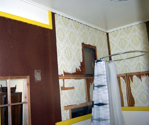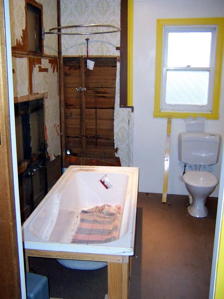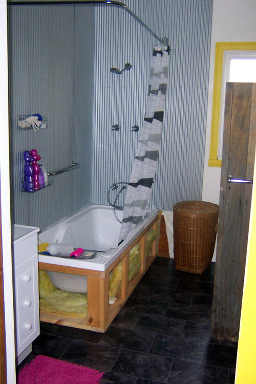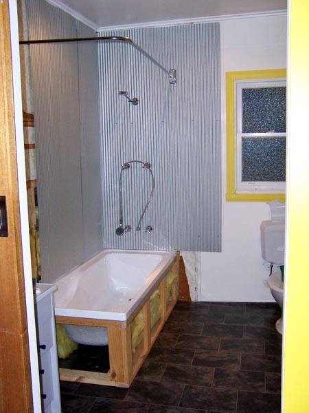 Eventually the bathtub was in place, a large angle rod went up for the curtain and I could finally shower without peeling cold wet curtain off my butt.