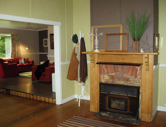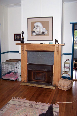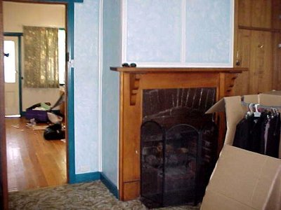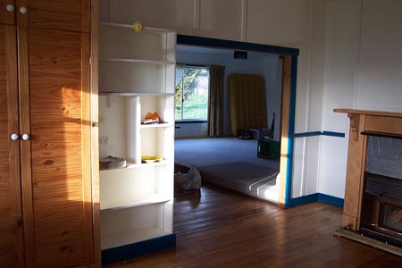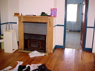 The other side of the fireplace in what is now the purple room – The walls were sponged blue over white. Not a good job. There was a carpet in this bedroom when I first moved in. My first job was to remove the carpet, sand the floorboards and varnish them.