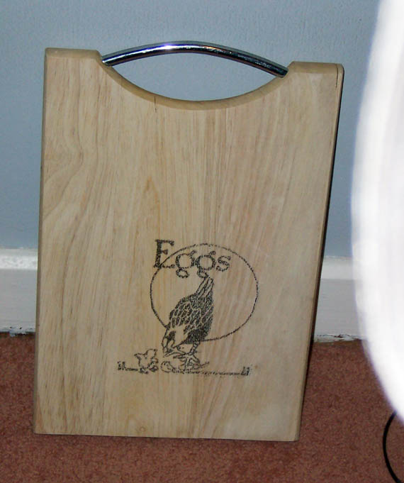 So, I sanded it again, got rid of the image, then, while I was at it, cut the metal handle off. I drilled two holes into the board to thread through a rope to hang it with.