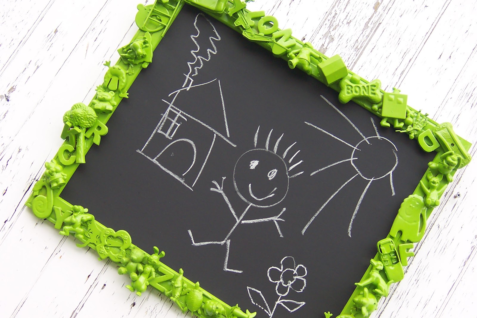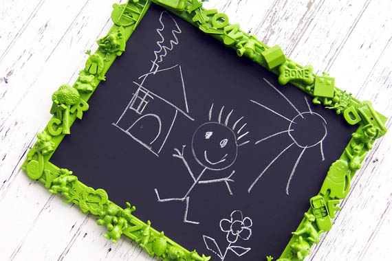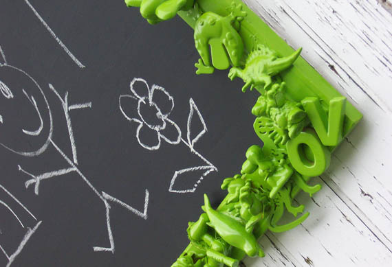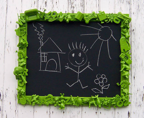 You’ve seen them, right? Those cute chalkboards for kids rooms, made by gluing old/broken toys to an old frame, then spraying it a bright colour?