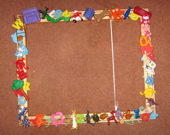 Well I did that. I sat down at my coffee table/work table in front of the TV one night and hot glued toys to the plain pine frame. Though, first, I have to mention that the frame I had wasn’t entirely flat so I had to sand and plane it to make it flat. Then I got out my friend and enemy, the hot glue gun.