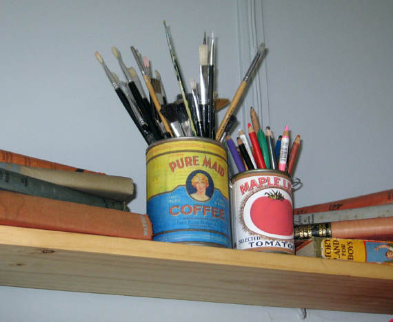 Yeah, I have quite a few pretty items in my home. Lots of things which are special to me cause they are items I’ve found in unlikely places, items I’ve saved, restored or made myself. Like the tins holding my brushes and pencils. Or the old tea crate holding my paints and the old nail crates holding my canvases which I found at a farm auction.