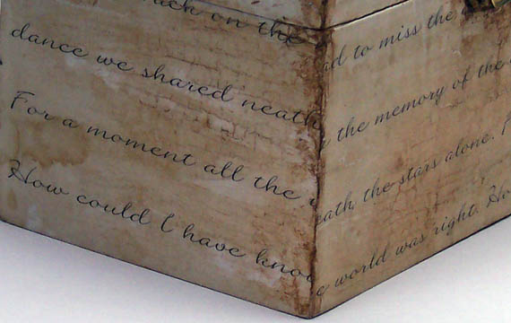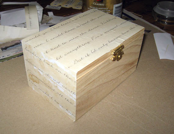 So I went about getting it done. I printed out the lyrics to the song in a font I liked. Using tea, I stained the pages to look old, then cut out panels. I glued those onto the box using a mix of PVA glue and water.