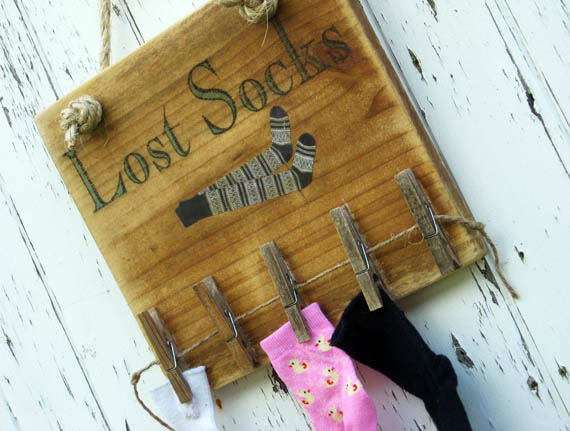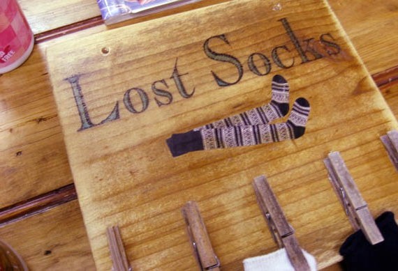 That’s when I took my first break. I didn’t like the type. It seemed like a good idea at the time, but then it just didn’t do it for me. I let the sign sit in the office for weeks before I thought I’d try putting an image on it… socks of course. I couldn’t find many socks pictures I liked so I settled for this one. Looking at it now, I’d probably have done it differently, but hey. Its done now. I just glued the cut out images to the sign and gave it all a coat of clear varnish.