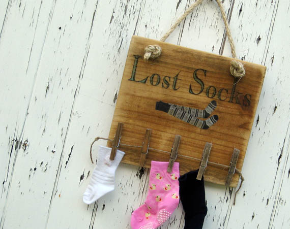 That’s when I took my first break. I didn’t like the type. It seemed like a good idea at the time, but then it just didn’t do it for me. I let the sign sit in the office for weeks before I thought I’d try putting an image on it… socks of course. I couldn’t find many socks pictures I liked so I settled for this one. Looking at it now, I’d probably have done it differently, but hey. Its done now. I just glued the cut out images to the sign and gave it all a coat of clear varnish.