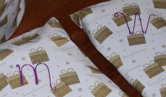 Then there’s the Christmas presents from last year. I usually like to do something special with my wrapping, but this time I got lazy and used bought wrapping paper. But instead of putting gift tags on the presents, I made wire initials. Then they could keep their own initial as well.