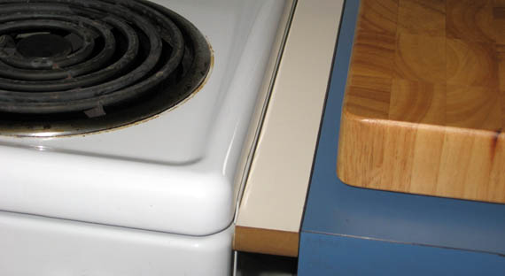 The gap it sits in is almost 700cm. That means gaps on either side of the stove. Different sized gaps. Gaps big enough to lose spoons, knives, pots and pans down. And food scraps, potato peels, sauce.