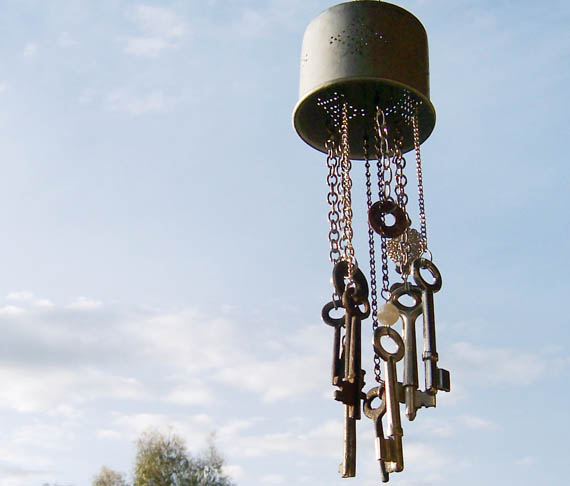 The one below is an ‘on my own’ creation made with a coffee filter (I think it came out of an old coffee pot), lots of different chains and keys – both shiny and rusty.