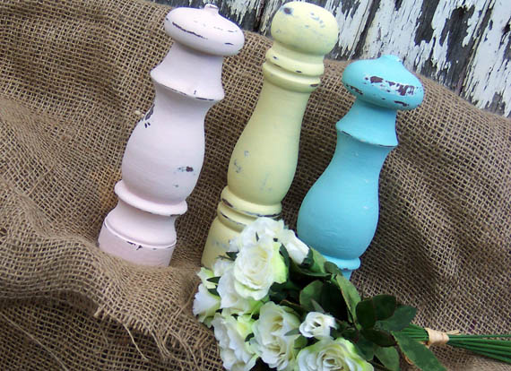 Somewhere along the line I picked up a few broken salt and pepper grinders cause I just liked the shape of them. I mixed up some pretty pastel colours to try out then roughed them up a bit.