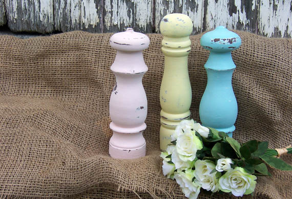 Somewhere along the line I picked up a few broken salt and pepper grinders cause I just liked the shape of them. I mixed up some pretty pastel colours to try out then roughed them up a bit.