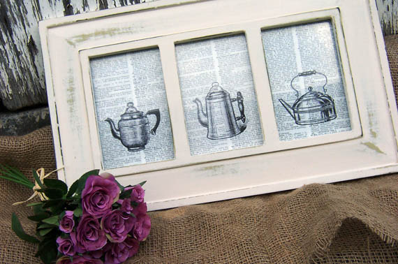 Then, using dictionary pages and some graphics from The Graphics Fairy, I created a triptych of coffee pots & kettle which would look brilliant in any country kitchen.