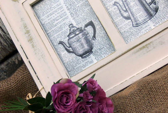 Then, using dictionary pages and some graphics from The Graphics Fairy, I created a triptych of coffee pots & kettle which would look brilliant in any country kitchen.