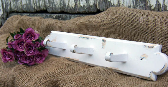 Another tip shop find. This poor little coat rack was in a bad state when I found it. Broken bits, chipped paint, screw holes and a couple of nails which had been used to fix it to a wall.