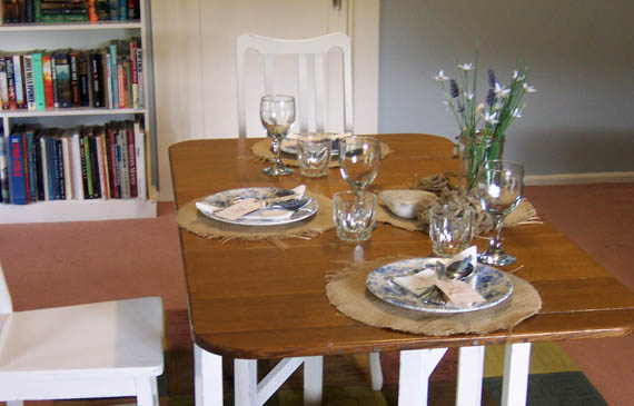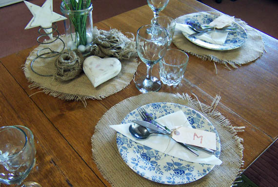 The table settings is simple. Burlap placemats, lavender sprigs from our garden, tags and twine holding cutlery.