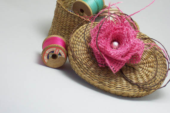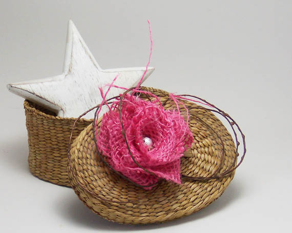 A pink burlap flower with a silver pearl center. Some florist wire for ‘interest’ and texture…