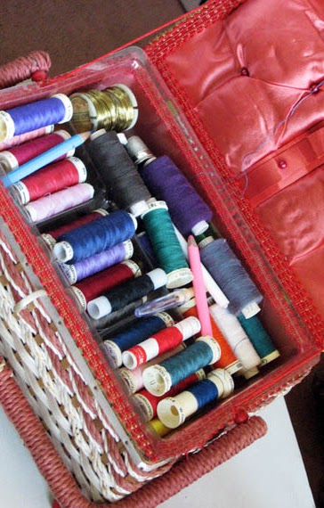 So, last night I sorted through it, re-wrapping unravelled thread, putting aside all the old bits and pieces which I’ll want to use somehow, somewhere, one day. Then I added my own threads into it and viola. A new sewing basket.