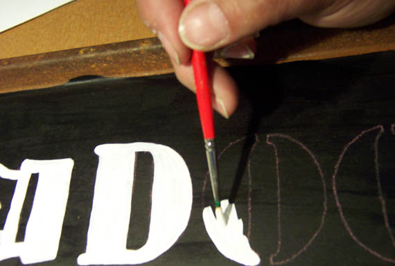 I used some of the enamel primer I am using on the house to fill in the letters, joining them up so they no longer look stenciled. I did this twice to get a smoother look.
