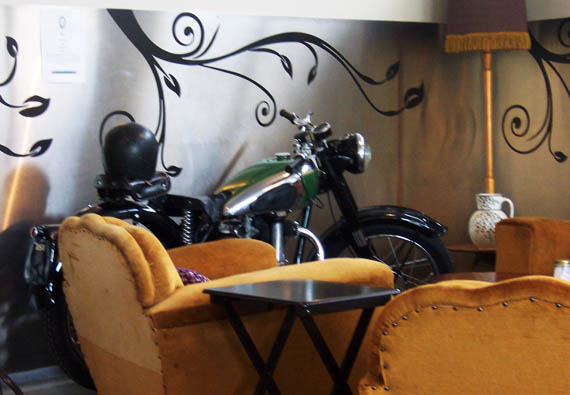 Its a cafe in a big cement-floored room filled with old furniture that wouldn’t be out of place at my grandmother’s house, and old motorcycles which could have come from my grandfather’s shed.