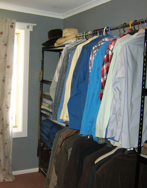 Still to do: A different curtain for the window. The light fitting. The other wall. There are suit jackets and pants, more shirts and many shoes that still need to find homes in the new look wardrobe room. Do I keep a chest of drawers to hold underwear and handkerchiefs or do I go with more of the same shelving and rails with baskets to hold the small stuff… there-in lies the question.