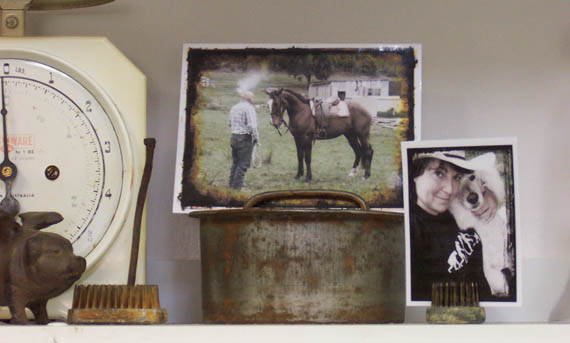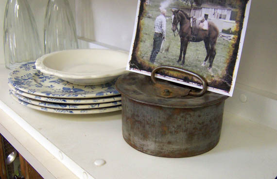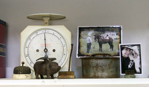 The little vignette below includes one of my scales, the lid off a small milk churn, 2 flower frogs and other old metal objects in the form of a cast iron flying pig and an old light switch.