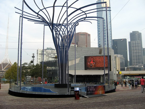The contrast of old and new is pretty startling. Federation Square is all modern buildings with sitting areas outside, cafes and restaurants everywhere, galleries and all kinds of entertainment. Including a large outdoor stage and a huge monitor. The whole setup reminded me of all those futuristic films and 1984.