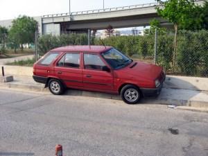 As always, parking remains imaginative in Athens. Sometimes just plain fearless. Like this red car. Notice the dints… obviously his parking style has left a few scars.