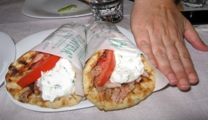Last but not least a real greek gyros souvlaki in a greasy greek pita. Nothing like the souvlakis they sell in Australia, which are just kebabs on lebanese bread with aspirations of becoming a souvlaki. These have a pita which is lighter and greasier, having been grilled on the hotplate in olive oil – very tasty despite, or perhaps because of, its 120,452 calories per bite. And tzatziki. YUM I repeat.