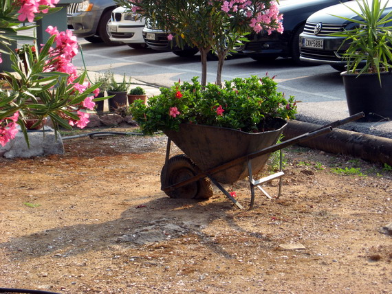 He still retained some character in his small garden – an old wheelbarrow holds flowers with a view of parked cars.