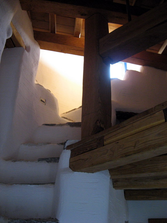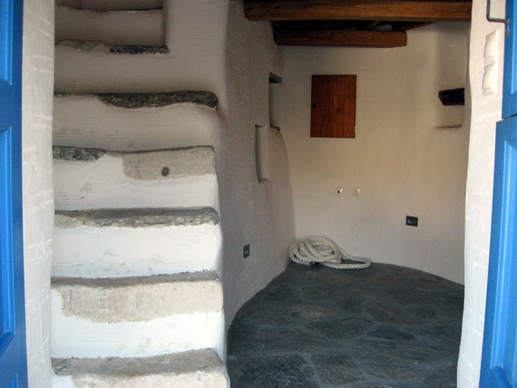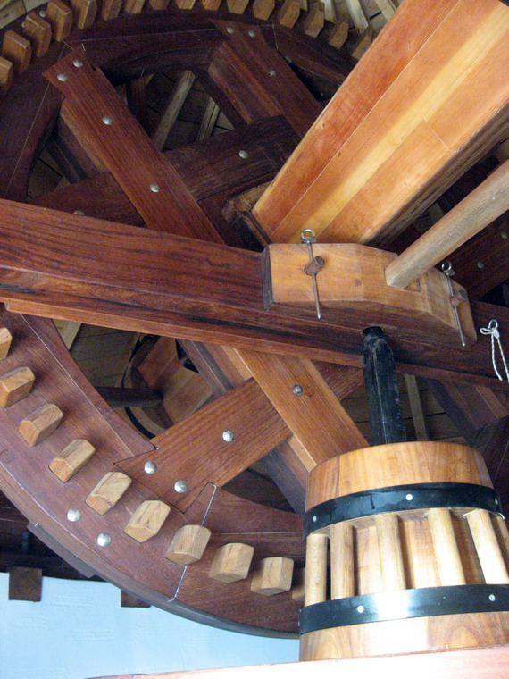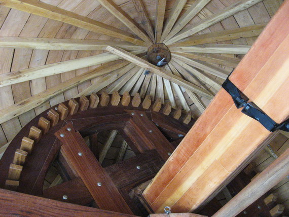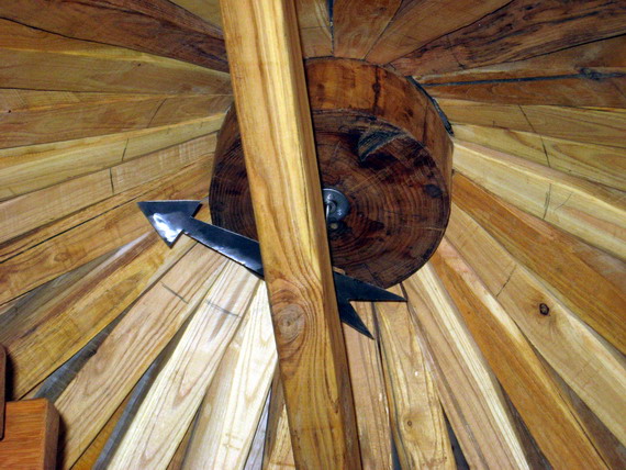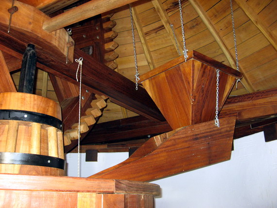 | The windmill upper level houses the mechanism which grinds the wheat into flour using the wind and sails. |