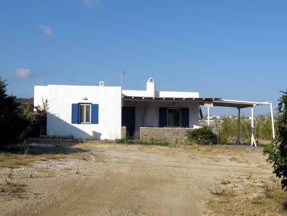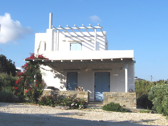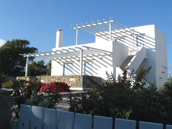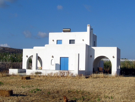 In the old days (ie the 70s, before the local government started imposing a style on new buildings) people would build square cement blocks for new houses. The ones who wanted to make their house look ‘cycladitiko’ in style would build square blocks, add a couple of arches, paint it white with blue shutters and call it good. This is a later model one and is one of the nicer examples of that style.