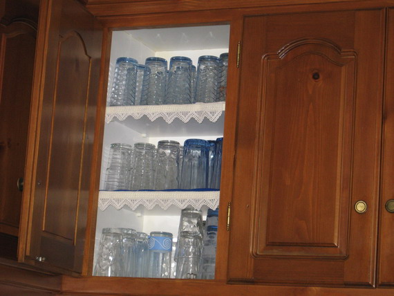 I love the lace on the shelves inside the glass cabinets. My aunt Dora has it in her kitchen in her house as well.