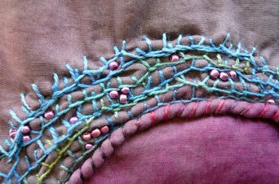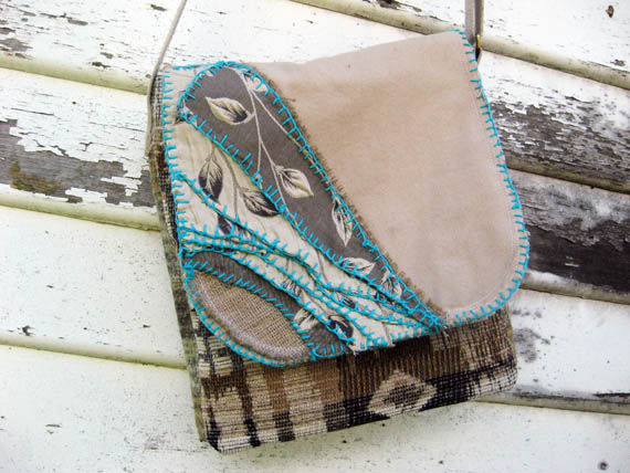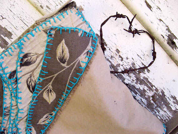 I used scaps of burlap and another fabric (using both sides) and some blue cotton yarn for the stitches. I opted to leave out the beads. Knowing me they’d be flying off left, right and center.