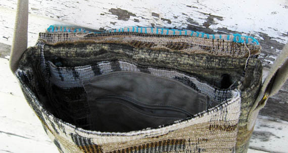 I re-used one of my canvas bags for the strap, flap and inner pocket. I just cut or picked off the bits I wanted from the old bag. I put the small zipped pocket inside on the divider, and put the straps on the sides of the bag.