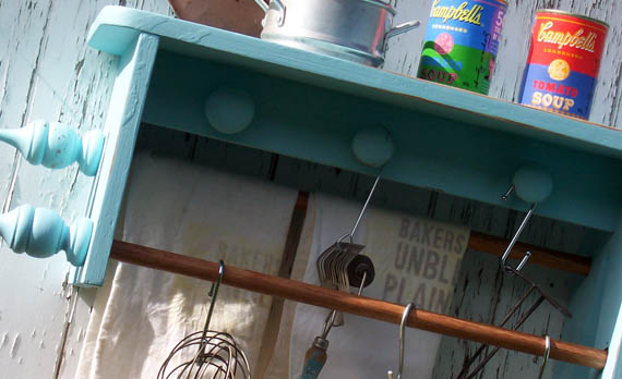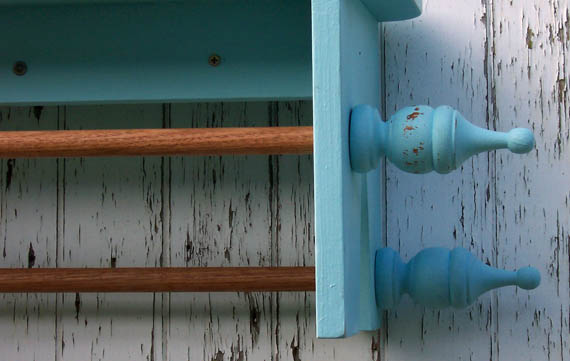 We went looking for bits of dowel, finials and knobs. We drilled holes, attached knobs and stained dowel. We painted it a nice light blue colour, then sanded, repainted and re-sanded…