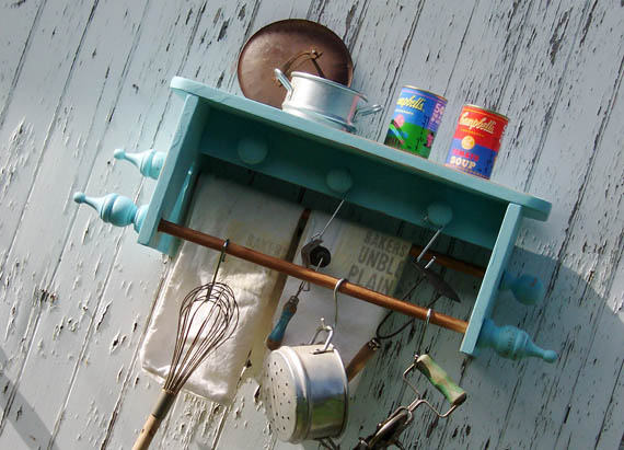 The lowly footstool was reborn into a cute, handy little kitchen shelf.Β