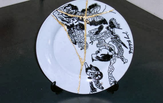 The raised, obvious mending on a broken plate, using gold. Gorgeous.