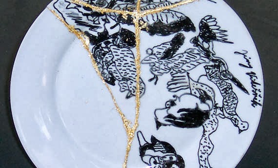 The raised, obvious mending on a broken plate, using gold. Gorgeous.